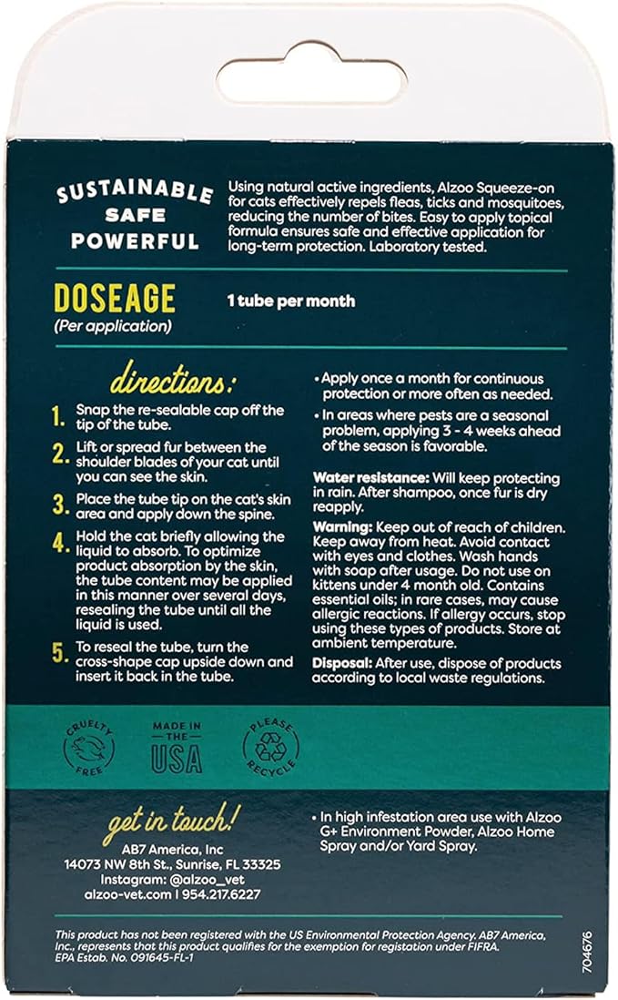 - SEASON PREVENTION - In areas where pests are a seasonal problem, applying ALZOO Flea & Tick Squeeze-On - Cats at least 3-4 weeks ahead of the season is favorable.