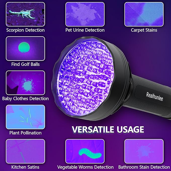 - 【Extreme Power UV Blacklight Flashlight】-- Professional grade UV flashlight black light with fuv protective glasses! Professional grade Ultra intensity 385-395 nm with 100 top quality LED uv flashlight helps you to find urine&stains EVEN in indoor or streetlight.Realhunlee black light UV flashlight is 70% Brighter than other lights,best choice for pet(dog cat rodent ) pee urine detection!