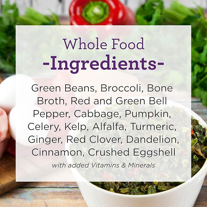 - This 3 pound bag of dehydrated whole foods makes 28, one pound meals when combined with a protein of your choice. Guaranteed Analysis: Crude Protein (min) - 13%, Crude Fat (min) - 1%, Crude Fiber (max) - 12%, Calorie Content (Calculated) - 2617 kcal ME/kg; 54 kcal ME/scoop