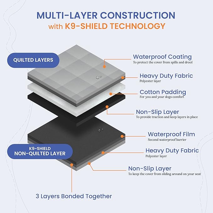 - ADVANCED WATERPROOF PROTECTION: Featuring exclusive K9-Shield waterproof technology, this back seat dog cover protects your car from spills, dirt, and drool. The non-slip backing keeps the cover securely in place, even with active pets. Please note that the seams are not watertight, but it provides reliable protection.