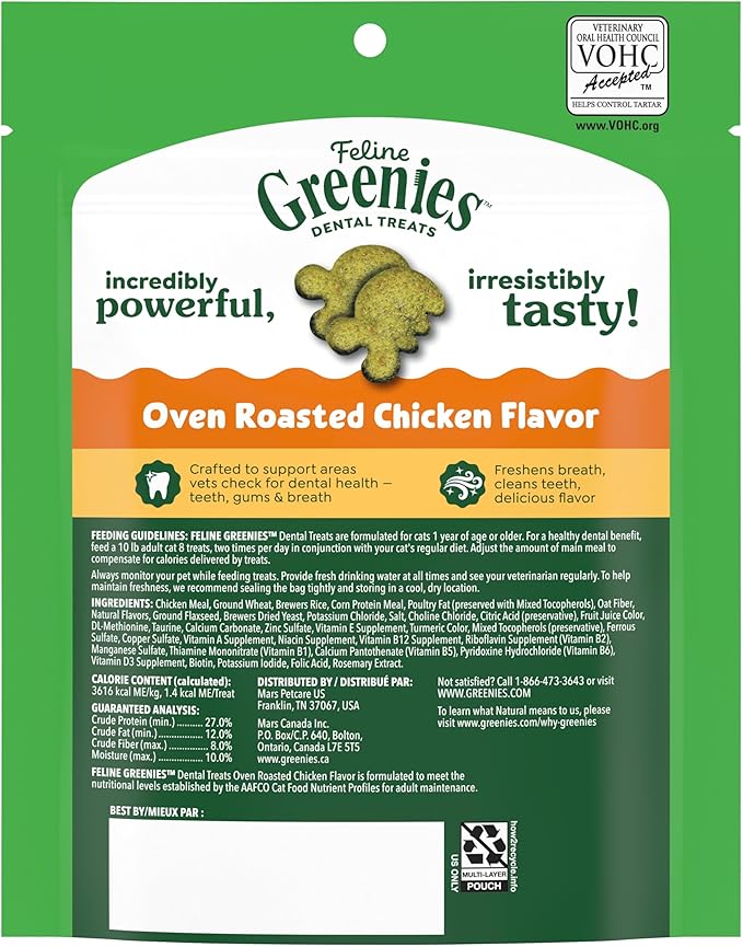 Greenies Feline Veterinarian-Recommended Adult Natural Dental Cat Treats, Oven Roasted Chicken Flavor, 4.6 oz. Pouch
