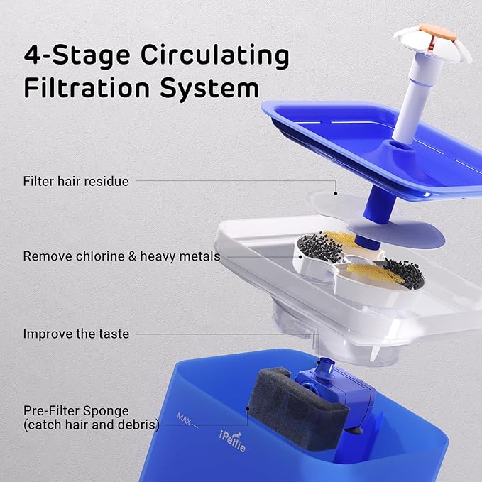 - Clean and Fresh Water: The iPettie Cat Water Fountain is equipped with a replaceable charcoal filter. This filter effectively removes impurities, such as hair, debris, and odors, from the water, ensuring that your pets always have access to clean and fresh water.