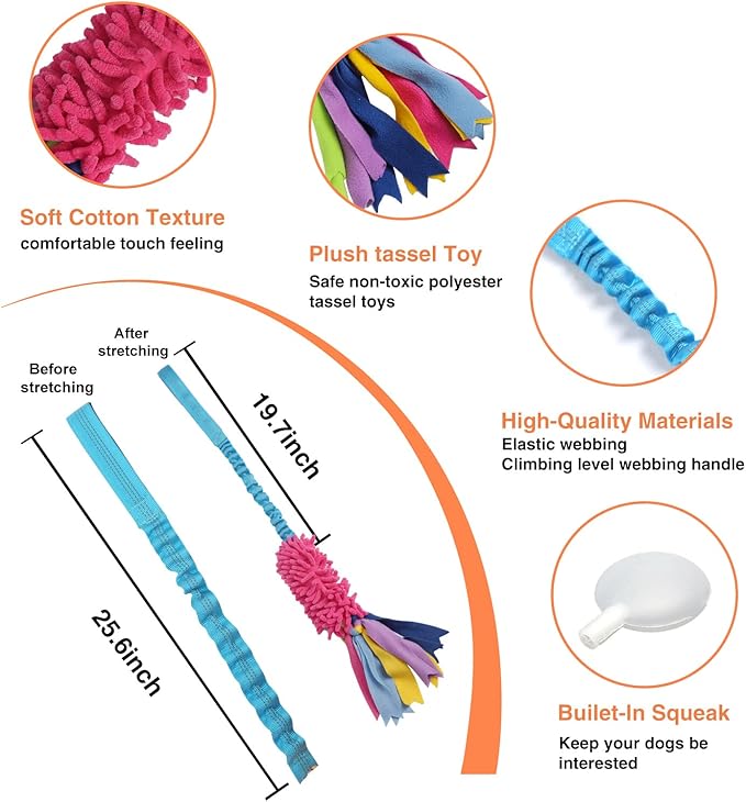 - Safe and Sturdy Material: This dog toy is made of high-quality chenille .Rock climbing grade elastic band is strong,flexible and durable.The dog tug toy is having a squeaker inside the material which is very suitable for dog fun,dragging, chewing,shaking,war and grapple
