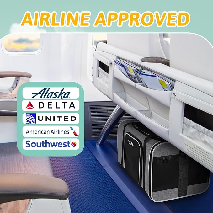 - 【AIRLINE APPROVED CARRIER 】Unfolded size:17"L×11"W×9.5"H, Petskd pet carrier is airline approved and can be placed under the seat in the cabin, it is mainly designed for ①Alaska Airlines:17x11x9.5", but also in compliance with ②Southwest Airlines:18.5x13.5x9.5" ③Delta Airlines:18x11x11" ④United Airlines:18x11x11" ⑤American airlines:18x11x11". We recommend you buy this carrier when you fly with the above-mentioned airlines.