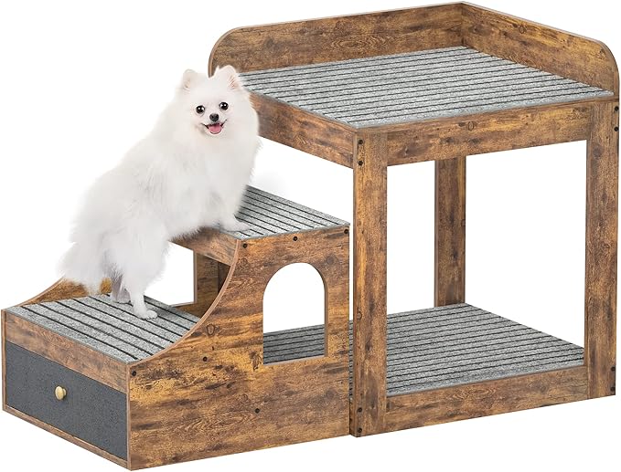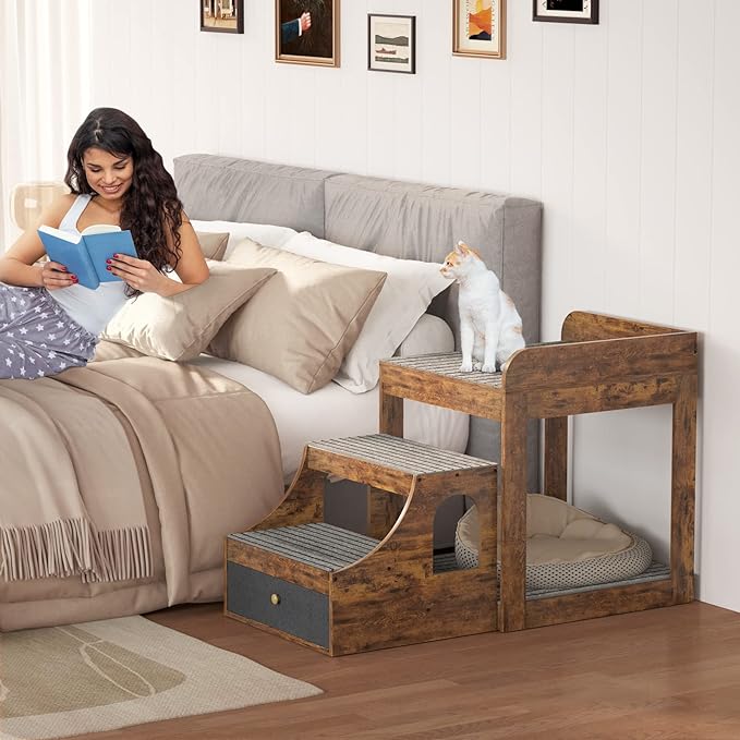 Cyclysio Super Large Multi-Level Pet Bunk Bed with Stairs, Rustic Platform Seat for Cats, Home Indoor Use, Large Size, Includes Mats and Drawers