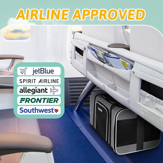 - 【AIRLINE APPROVED CARRIER 】Unfolded size:17"L×12"W×8.5"H, Petskd pet carrier is airline approved and can be placed under the seat in the cabin, it is mainly designed for ①JetBlue Airlines:17x12.5x8.5" ②Allegiant Airlines:19x16x9", but also in compliance with ③Southwest Airlines:18.5x13.5x9.5". We recommend you buy this carrier when you fly with the above-mentioned airlines.