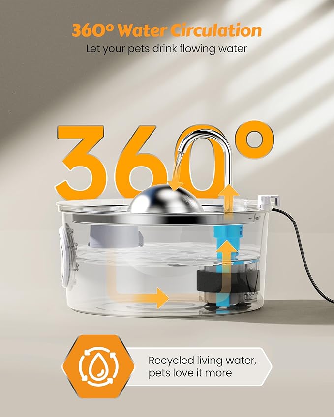 - 【Silent Pump, Silent Night】 The water fountain for cats inside combines a low-noise pump with a specially designed spherical structure to reduce noise during operation. Provides a good night's sleep for you and your pet. Our pumps come with a two-year warranty. If you encounter any problems, please contact us. Additional accessories are also available for purchase in our store.
