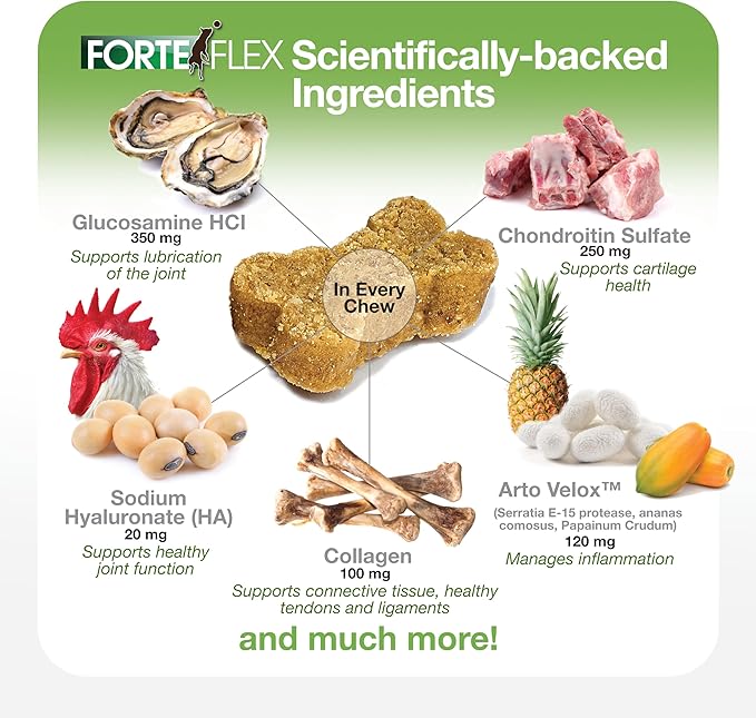 - ✅Faster relief with enzymes Forte Flex is the only dog joint supplement powered by our exclusive Arto-Velox protease enzyme blend. These enzymes manage the inflammation cycle at its source, helping your dog regain mobility and comfort faster than ordinary glucosamine-based products. That means more walks, more play, and more pain-free moments together.