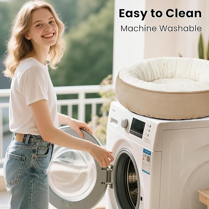 - Donut Cuddler Shape: The round dog bed allows pets to curl up while the raised rim creates a sense of security and provides head and neck support. Premium ultra-soft filling offers joint and muscle pain relief.The 20 inch round pet bed is perfect for cats, small dogs and other pets up to 15 lbs.