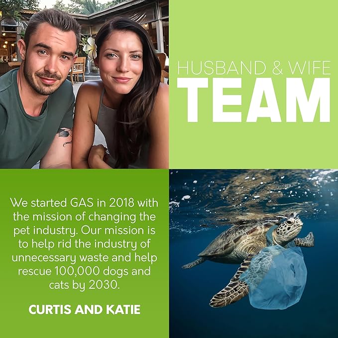 - SMALL BUSINESS WITH A BIG HEART - Founded in 2018 by Curtis and Katie, a dynamic husband and wife duo, G.A.S is not just our business - it's our passion. Dedicated to revolutionizing the pet industry, our small team is big on making a positive impact on the planet and helping animals in need. It's our mission to rescue 100,000 animals before the end of 2026.