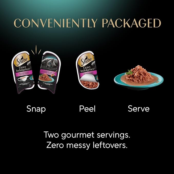 - Perfect For Picky Eaters: Made with real meat, Sheba Gravy Indulgence features cuts of salmon covered in a thick, decadent gravy for a protein-rich meal with irresistible flavors in a variety of textures