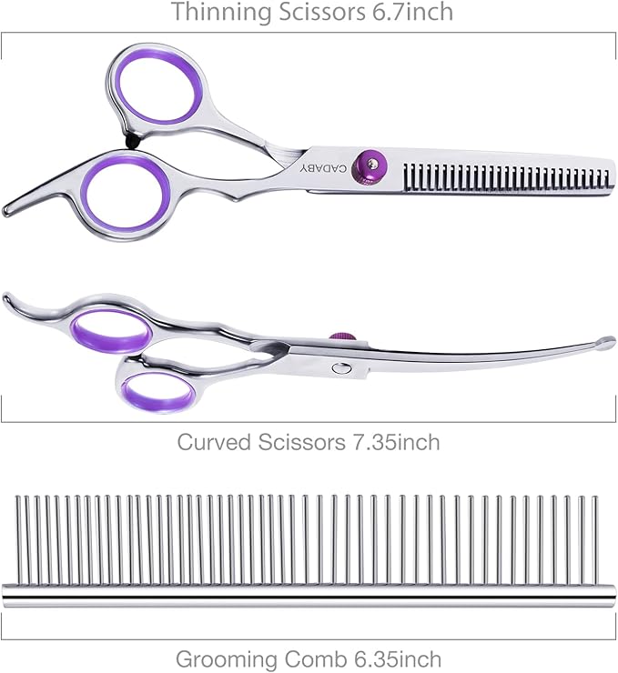 - Professional Pet Grooming Scissors Kit: We use leather waterproof case include 1 X 7.35" curved scissors, 1 X 6.7" thinning scissors,1 X pet comb. Our dog grooming scissors are longer than others, you and your pet will a more comfortable experience