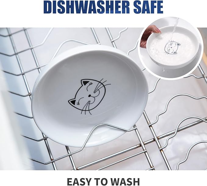 - 【Safe & Easy to Clean】: shallow cat plates made of high-temperature fired food-grade ceramic, cadmium-free and lead-free, non-toxic and hygienic. The ceramic is also thicker and heavier. 100% safe for your kitty. Smooth ceramic surface offers extra convenience to wash, prevents folliculitis on the chin of your beloved cats. Safe for dishwasher, microwaves and ovens. The raised wide cat food bowl can be easily stacked to save the space in dishwasher.