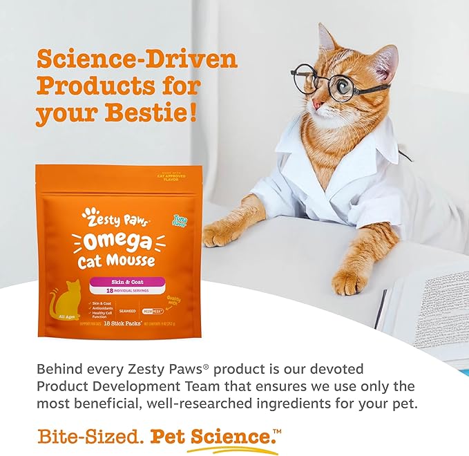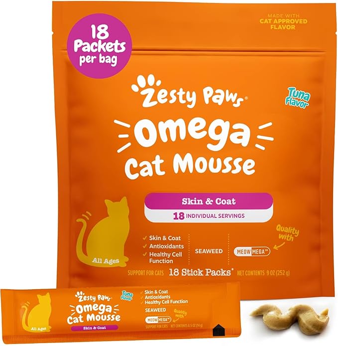 - OMG Flavor, Omega Support! - Zesty Paws squeezable cat puree yogurt lickables Omega cat mousse lickable cat treats squeezie is a delicious way to support your cat's skin, coat, and cellular function to keep your feline bestie feeling healthy, happy, and Zesty.