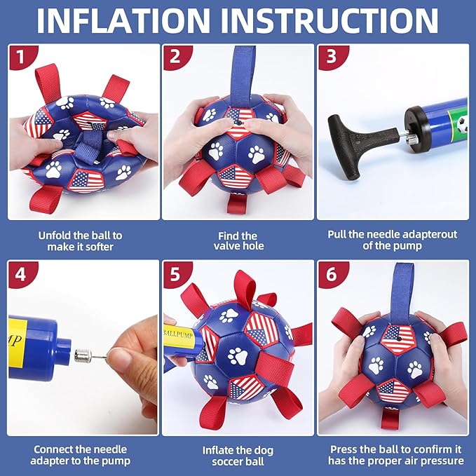 - ⚽Pump & Needle Adapter Included: The herding balls for dogs comes deflated. There's a needle point adapter and a pump inside as well while other items in the same market only include a ball needle. The soccer ball dog toy is 8 inches in diameter, perfect for large breeds, not for aggressive chewers.