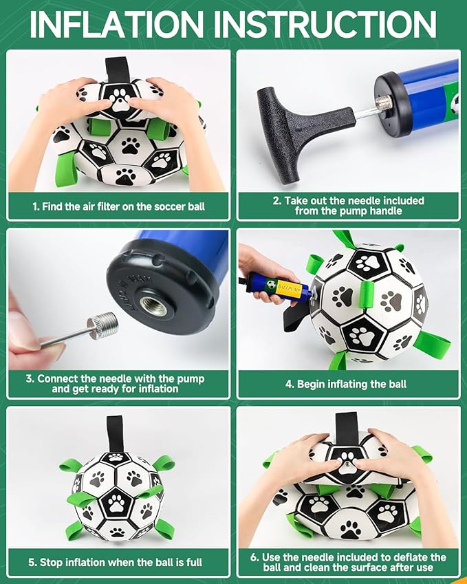 - PUMP and Needle Adapter Included: The herding balls for dogs comes deflated. There's a needle point adapter and a pump inside as well while other items in the same market only include a ball needle. The large soccer ball dog toy is 10 inches in diameter, perfect for giant and large breeds, not for aggressive chewers