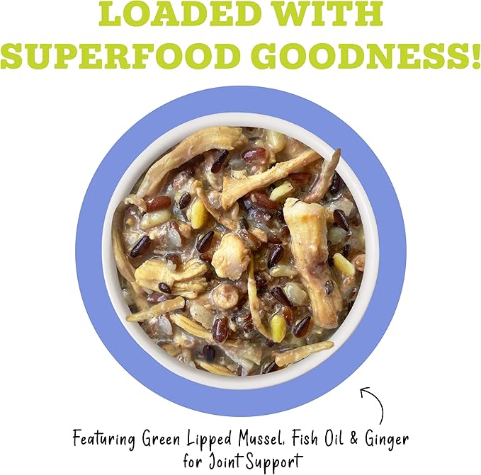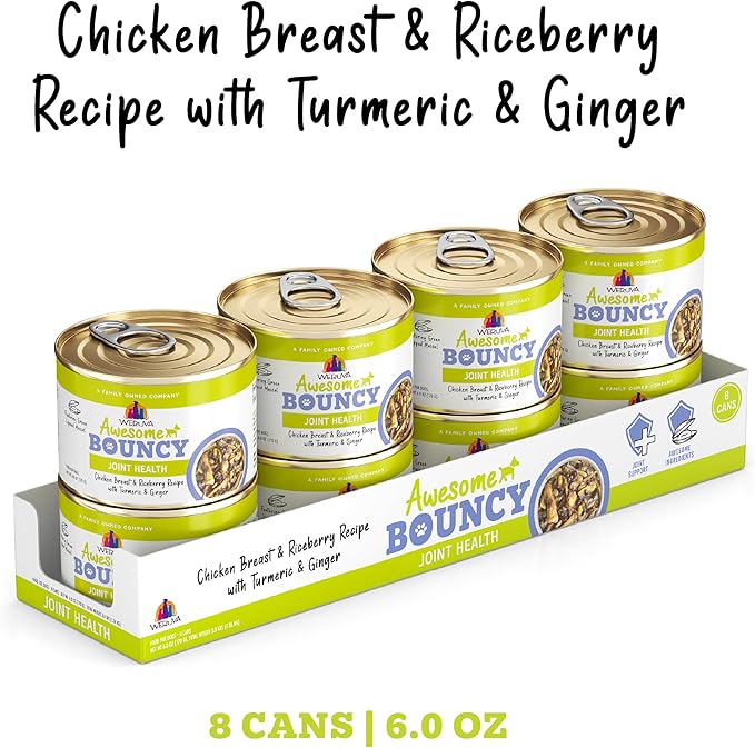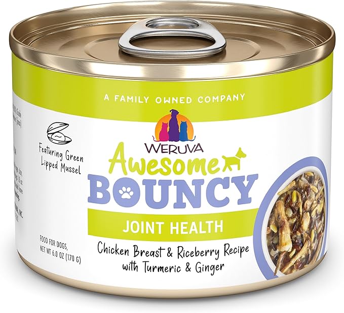 - Weruva Awesome Bouncy chicken, brown rice, and riceberry with turmeric and ginger to support joint health