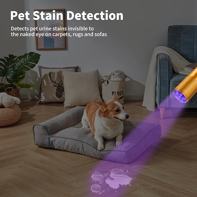 - Pet urine detector: UV flashlights are perfect for revealing urine stains from pets such as cats and dogs. No more crawling around and sniffing the floor, or steam cleaning the entire carpet, it can easily and accurately find the stained area