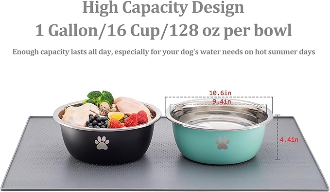 - Large Capacity: Enough capacity lasts all day without a refill and to make sure your dog doesn't drink from toilet. Each dog bowl holds 16 Cup/128 fl.oz food or water and is 10.6 inches dia of the upper bowl, 7.48 inches dia of the bottom, and has a 4.4 inches height. Biggest dog bowls on the market. Heavy duty stainless steel, thick enough for being left outdoors in all sorts of weather