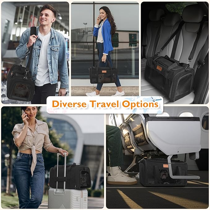- ANTI-ESCAPE SAFETY DESIGN: The PETUX cat bag carrier has 2-way locking zippers that help prevent accidental opening while you’re moving between terminal doors, hotel hallways, or car seats. Inside, the built-in safety leash adds another layer of control (attach to a harness for best safety) when you need to open the top for a quick check or reassurance