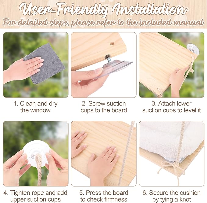 - Effortless Setup: comes with a paper installation instructions, this cat window seat assembles in minutes without other tools; for optimal grip, clean both the window and suction cups before use, and adjust suction cups by applying pressure for maximum stability (note: soak suction cups in hot water for 5-10 minutes before use for firmer hold)