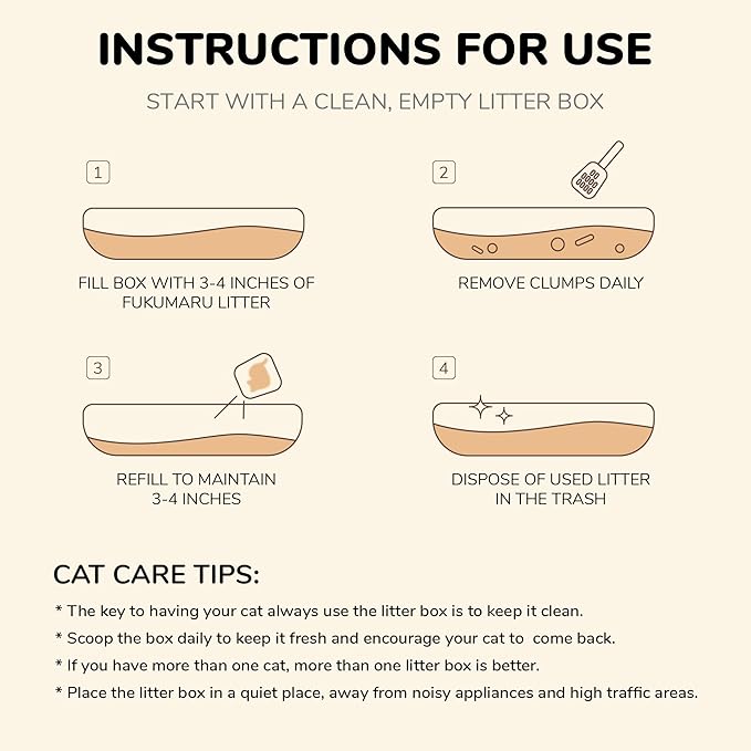- Excellent Clumping: FUKUMARU cassava cat litter features outstanding clumping ability. It can forms dense instantly and you can smoothly scoop it in whole piece, not easy to break apart. It effectively prevents litter from being carried out of the box, ensuring easy cleaning with no residue, delivering a polished-level cleanliness and creating a tidy space for your cat