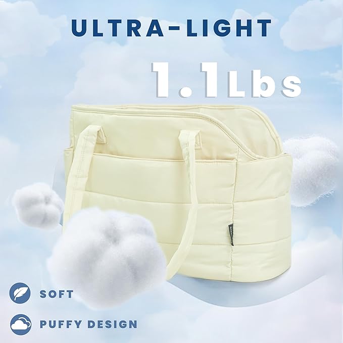 - Ultra-Light & Stylish Puffy Design: Weighing just 1.1 lbs, this chic puffy dog carrier is crafted from ultra-light materials with a fashionable quilted exterior. The removable padded hard-bottom base provides strong, stable support. Perfectly sized at 17"L x 8"W x 12"H to comfortably carry small dogs up to 15 lbs (6.8 kg)—ideal for Chihuahuas, Yorkies, puppies, and other toy breeds.