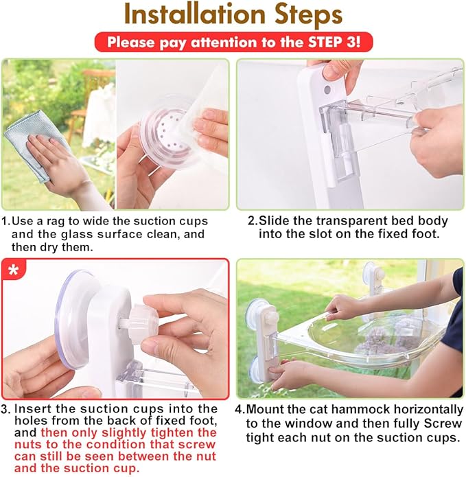 - Easy to Install & Sturdy: No tools, no fuss-the assembly of this cat perch can be completed in just a few simple steps. And then push the 4 enlarged suction cups on it against the glass and tighten them, which provides impressive grip and can hold the perch firmly onto the surface. The sturdy construction ensures a safe and comfort lounging spot for your feline friends.