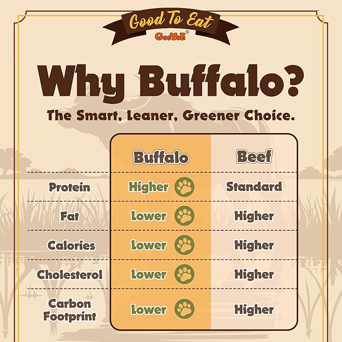 - Healthier & Tastier: Buffalo is a lean protein with less fat and fewer calories than beef, making it a nutritious choice for your dog. Naturally rich in essential nutrients and beneficial fatty acids, it supports a shiny coat, healthy skin, and overall well-being.