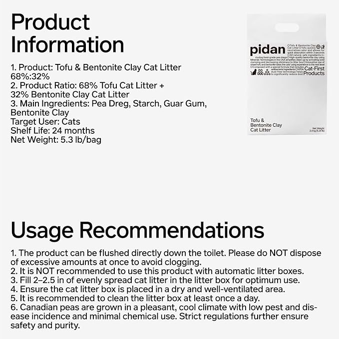 - Material : Main Ingredients: Pea Dreg, Starch, Guar Gum, Bentonite Clay, Product Ratio: 70% Tofu Cat Litter + 30% Bentonite Clay Cat Litter; Main Ingredients: Pea Dreg, Starch, Guar Gum, Bentonite Clay, Product Ratio: 70% Tofu Cat Litter + 30% Bentonite Clay Cat Litter;