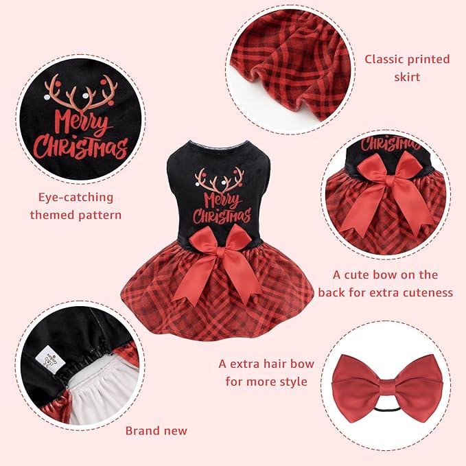 CuteBone Christmas Dog Dresses Velvet Holiday Small Dogs Clothes Onesie Pet Apparel Girl Puppy Skirt with Bow Hair Rope CVA59M-D