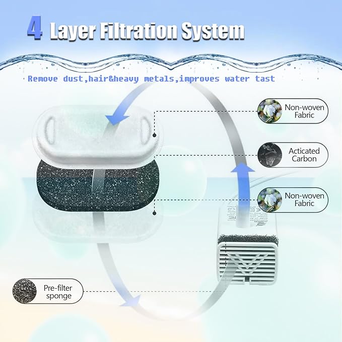 - 【Multiple Filtration & Fresh Water】The three-layer filtering system formed by cotton layer and activated carbon can capture hair and debris, remove odor, heavy metals and odors in water, and purify every drop of water for your pet