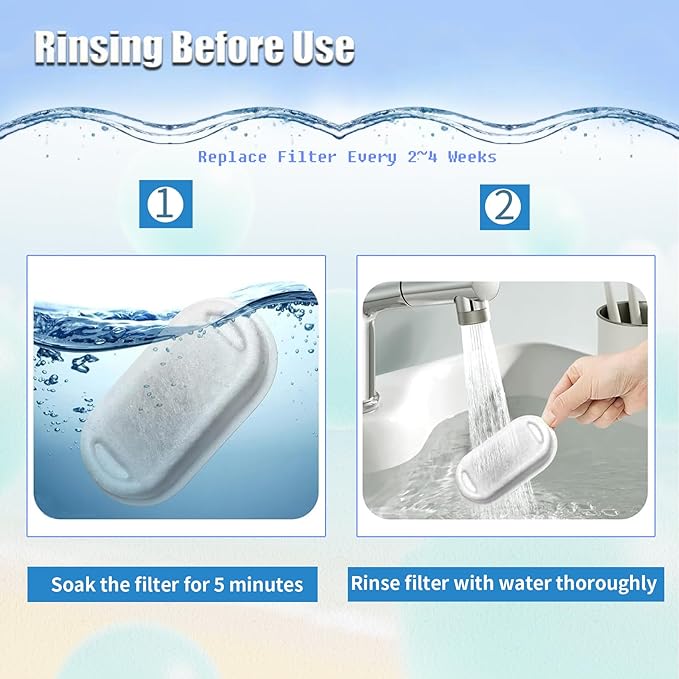 - 【Cleaning and Replacement】Before use, soak and flush the pet fountain filter with clean water,clean the filter every time you change the water of the cat fountain, and change the pet water fountain filter every 2-4 weeks.