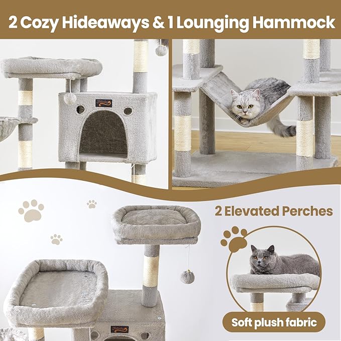 - 【Comfort Zone for Multi-Cat Homes】 The tall cat tree's platforms, enclosed condo, and hammock are all padded with soft plush for superior comfort. This design of multiple, dispersed resting areas helps cats establish individual territories, effectively preventing competition and promoting peaceful coexistence among your large feline friends