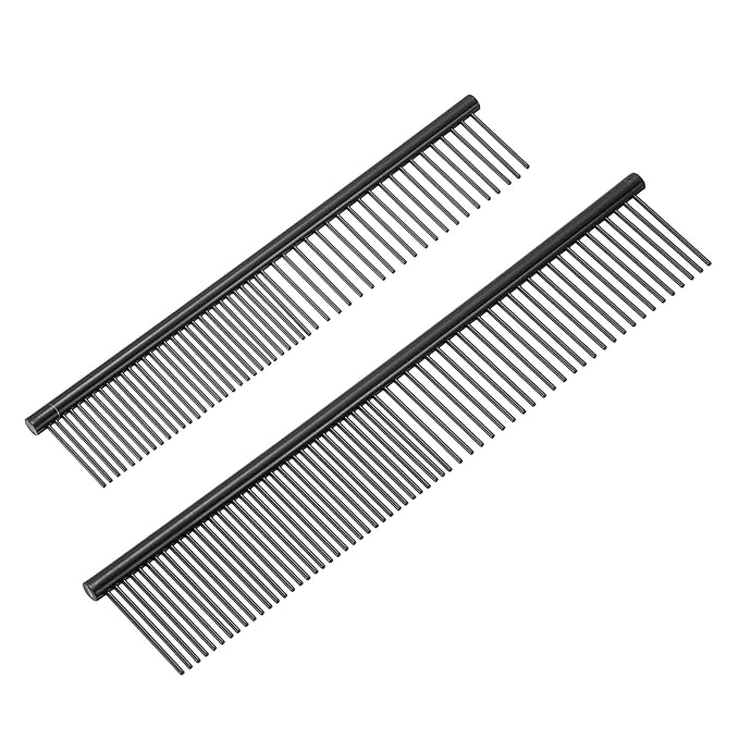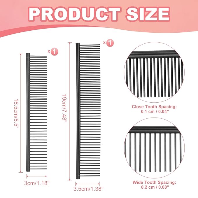 - Product Specifications: Cat Comb Size: 3.5 x 19 cm / 1.38 x 7.48 Inch, 3 x 16.5 cm / 1.18 x 6.5 Inch (W x L); Close Tooth Spacing: 0.1 cm / 0.04 Inch; Wide Tooth Spacing: 0.2 cm / 0.08 Inch; Color: Black Coated; Material: Stainless Steel; Packing List: 2 Pack x Cat Grooming Comb