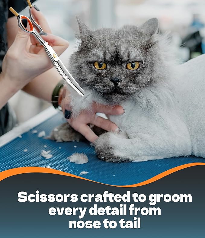 - sharp and Fine Cut - These dog & cat grooming scissors are sharpened by handicraftsmen. Experts check the scissors' sharpening one by one. Consequently, the blades of these pet grooming scissors are extremely sharp, and the cut is very fine, precise, and fast, It works very well on any type of coat, regardless of whether it is thick, wiry, or curly.
