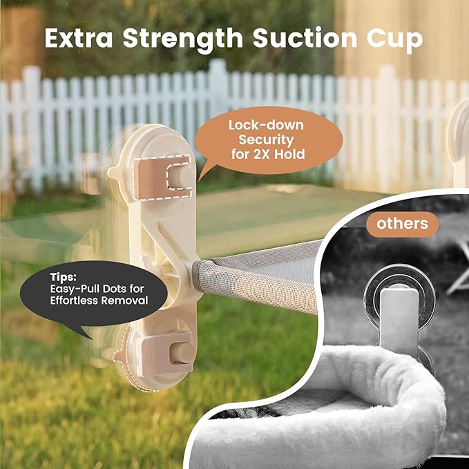 - HOLDS UP TO 55 Lb-Unlike flimsy 2-cup models, 4 suction cups system distributes weight evenly for rock-solid support. We combine these with a reinforced metal frame to create an unbreakable foundation that won't bend or wobble. This heavy-duty synergy is rigorously tested to safely hold up to 55 lbs, gives your cats the freedom to leap, lounge, and sunbathe without a second thought.
