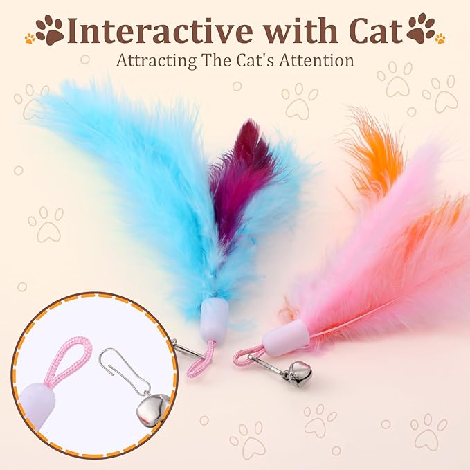 - Colorful Variety: this cat wand feather toys refill set includes 60 vibrant feather refills in four unique styles; With colors like pink, light blue, and orange, these cat wand feather toys instantly grab your cat's attention; The bells integrated with toys enhance play engagement, sparking curiosity and instigating their natural playful instincts