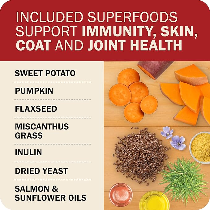 - TRANSPARENT INGREDIENTS: High-quality animal proteins are always the first 5 ingredients for optimal canine nutrition and superfoods like flaxseed, miscanthus grass, and salmon oil are added to support immunity, skin, coat, and joint health