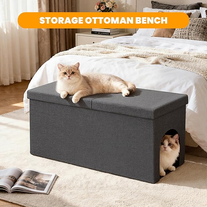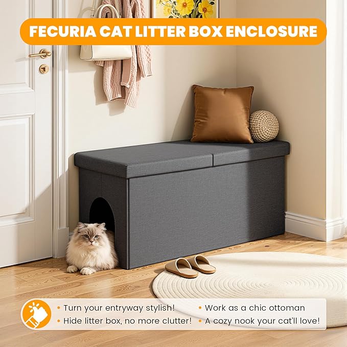 - š¾ Hide Mess, Elevate Aesthetics: Fecuria cat litter box enclosure doubles as a stylish ottoman, blending seamlessly with your home decor. Whether placed in your living room, entryway, or bedroom, our hidden cat litter box lets your guests only notice a chic bench, not a pet toilet. It's the nice way to keep your space effortlessly elegant while staying pet-friendly, making it a must-have for any cat owner who values both style and functionality.
