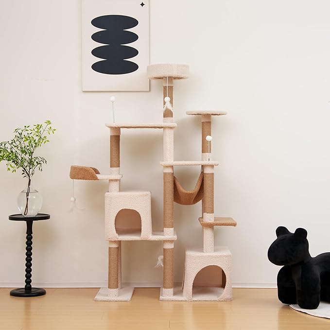 - 【COMFORTABLE HOME】 - 2 large houses for the best rest, a hammock for fun, 7 platforms for rest, balls and toys for fun.Whether your kitten wants to stretch out on a spacious perch, curl up in a plush hole room, or release the urge to scratch on a sisal pole, this multifunctional cat tree tower works perfectly as a recreation paradise,which can make your fur baby's day full of fun and excitement!