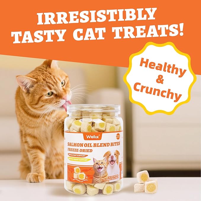- Drool-worthy Taste - 95% of pets love it! Wellix salmon oil cat treats lock in pure salmon oil inside a crunchy chicken bite for cats & dogs. Feed directly or mix into meals to meet their nutritional needs and satisfy your pet's taste buds