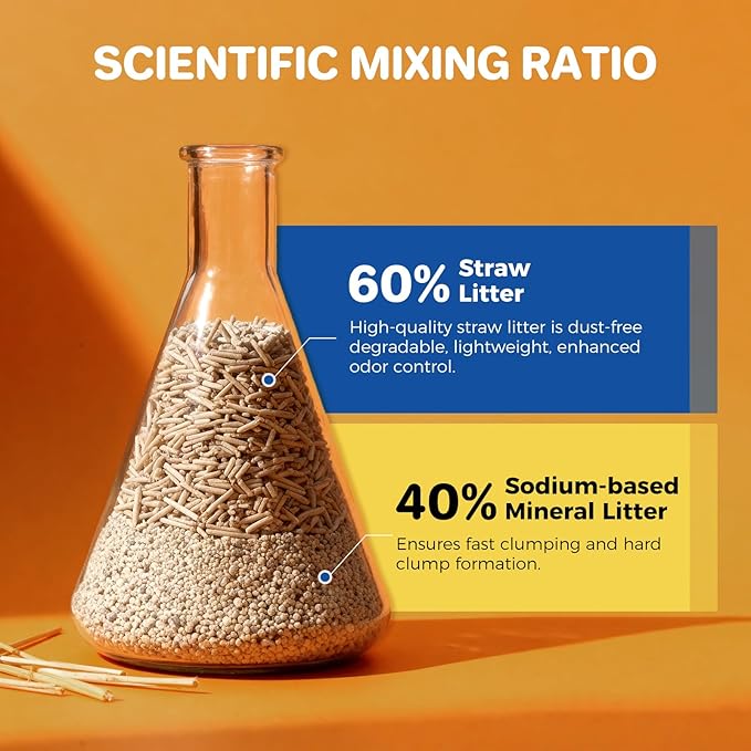 - 【Super Absorbent&Lasts Longer】Thanks to the scientific ratio of our straw and sodium-based mineral litter.Our mixed cat litter absorbs 3x more liquid than traditional clay litter.You need less per use for solid cat litter clumping,making each bag last significantly longer and saving you from frequent changes