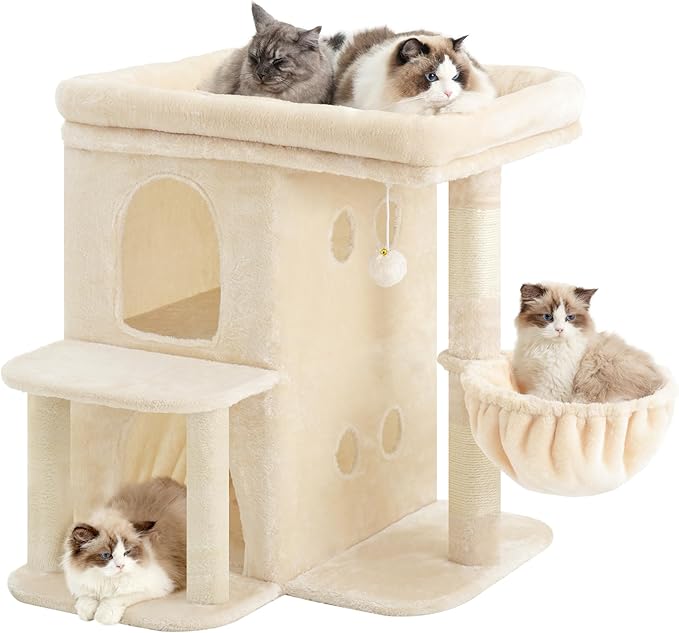 Heybly Cat Tree, 25.6-inch Cat Tower with Spacious Top Perch for Large Cats, Stair-Style Cat House Furniture with Dual-Layer Condos, Sisal Scratching Posts, Cozy Basket & Pompom, Beige HCT204SM