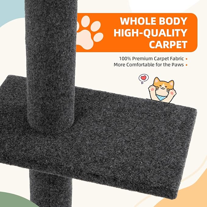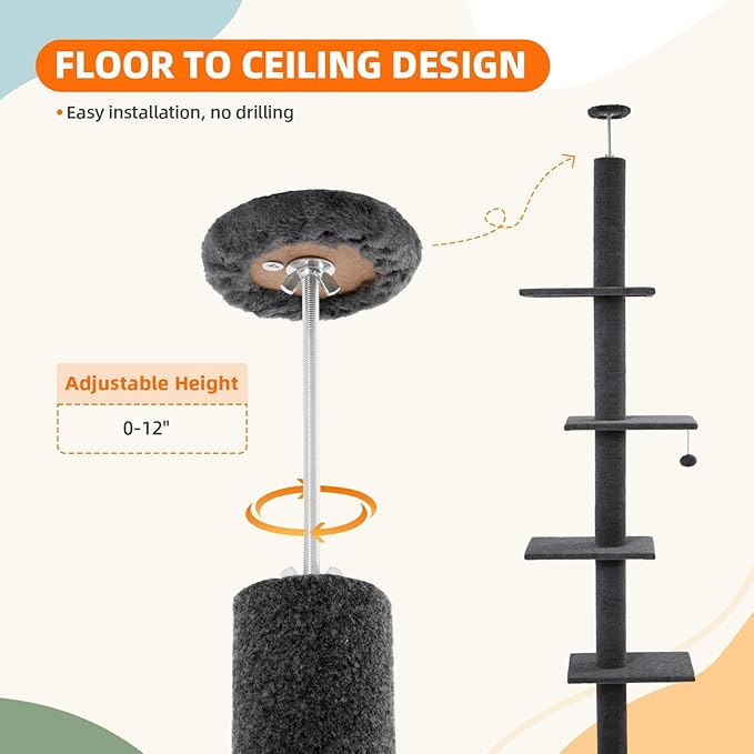 - Multifunctional Activity Center: This cat tree floor to ceiling is easy to match with your home style. This versatile tall cat tree combines cat scratching posts and multiple platforms. Cat tower for indoor cats meet the needs of cats for indoor climbing, scratching and resting