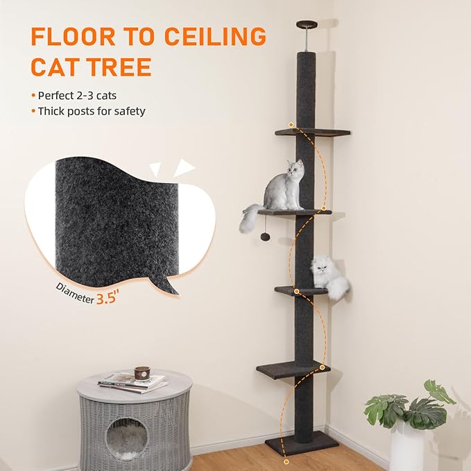 Cat Craft Cat Tree Floor to Ceiling Cat Tower 98-108" Carpet Kitten Tree 5-Tier Scratching Post and Mat Cat Pole for Indoor Cats, Charcoal