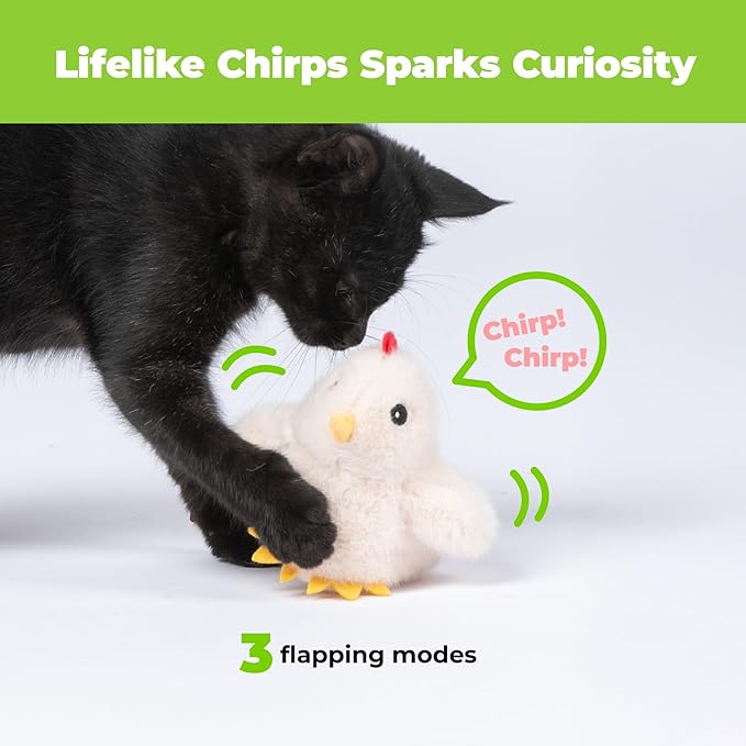 - Realistic chirping sounds but quiet for apartments: Built-in speaker plays duckling/chick chirps so skittish cats warm up fast. Three alternating flapping and chirping modes to mimic cat prey with flapping wings that move and fly. Great bird cat toy for indoor cats