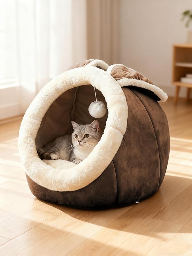 - Cute and fun cat beds for indoor cats:The rabbit shape is cute and lovely,The cat cave bed has two big floppy ears and a short, round, fluffy tail.There is also a hanging ball in the cat cave bed, This feature promotes playtime for cats,Make it fun for the cat