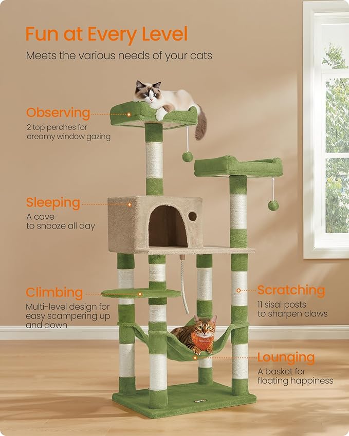 Feandrea Cat Tree, 56.3-Inch Cat Tower for Indoor Cats, Multi-Level Cat Condo with 11 Scratching Posts, 2 Perches, Cave, Hammock, Grass Green and Camel Brown UPCT015CB02
